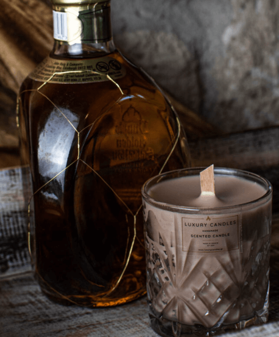 Κερί σε vintage γυάλινο ποτήρι ουίσκι : Whiskey & Caramel (400γρ. – 80 ώρες καύσης)