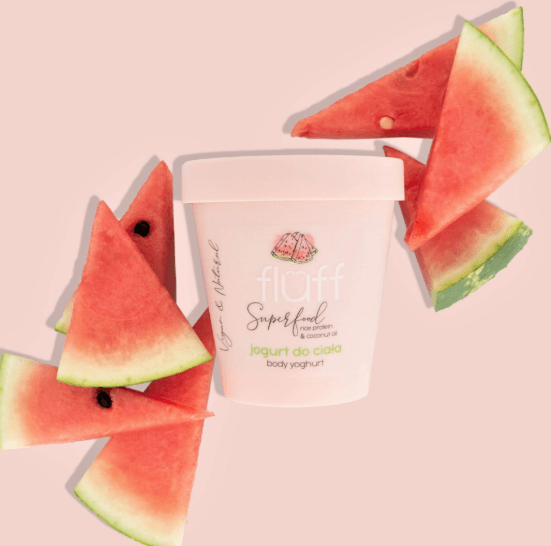 Το Fluff ”Juicy Watermelon” Body Yogurt είναι ένα γιαούρτι σώματος με άρωμα ζουμερού καρπουζιού. Απλώνεται εύκολα στο δέρμα και απορροφάται γρήγορα, ακόμα και από τις πιο βαθιές στιβάδες της επιδερμίδας, χωρίς να αφήνει ίχνη λιπαρότητας. Είναι λεπτόρρευστο και βελούδινο, αφήνει απαλή και μεταξένια την επιδερμίδα με μία μόνο εφαρμογή. Διατηρεί το δέρμα ενυδατωμένα ακόμα και μετά από 16 ώρες. Είναι ένα φυσικό προϊόν Vegan με λαχταριστό άρωμα. Περιέχει πρωτεΐνη ρυζιού και έλαιο καρύδας.