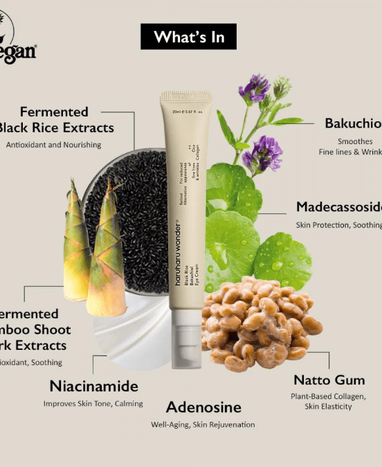Με ζυμωμένο Μαύρο Ρύζι, εκχύλισμα Bamboo Shoot Bark και φυτική βακουτσιόλη (συστατικό αντικατάστασης ρετινόλης) 5.000ppm, η κρέμα ματιών Μαύρο Ρύζι της haruharu wonder καταπολεμά τις ρυτίδες γύρω από τα μάτια. Αυτή η κρέμα ματιών διπλής λειτουργίας που βοηθά να απαλλαγείτε από τους μαύρους κύκλους και φωτίζει τη σκοτεινή περιοχή των ματιών.