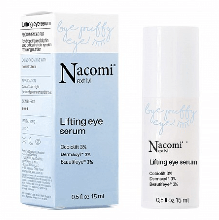 Αυτός ο ορός lifting βελτιώνει την κατάσταση του ευαίσθητου δέρματος γύρω από τα μάτια, δίνοντάς του μια φρέσκια και νεανική όψη. Το συμπεριλαμβανόμενο BEAUTIFEYE® εξουδετερώνει το σχηματισμό μαύρων κύκλων κάτω από τα μάτια, ανασηκώνει τα πεσμένα βλέφαρα και ενισχύει το περίγραμμα των ματιών. Το δραστικό συστατικό COBIOLIFT δημιουργεί ένα βιολογικό φιλμ στην επιφάνεια του δέρματος, το οποίο συσφίγγει και λειαίνει τη δομή του. Το σύμπλεγμα DERMAXYL ™ σε συνδυασμό με τη σύνθεση φυσικών ελαίων θρέφει σε βάθος και αναπλάθει το δέρμα, διεγείροντας την αναδόμηση του υδρολιπιδικού φραγμού. Επιπλέον, μειώνει τα σημάδια κόπωσης και μειώνει το πρήξιμο.