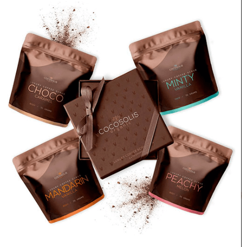 4 scrubs, το καθένα με δικό του σκοπό. Τρία διαφορετικά για το σώμα και ένα για το πρόσωπο, με συστατικά υψηλής ποιότητας: μείγμα από απαλό αραβικό καφέ, μαύρη ζάχαρη που λιώνει, αλάτι Ιμαλαΐων και ειδικός συνδυασμός από επιλεγμένα Bio, εξωτικά έλαια.