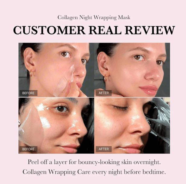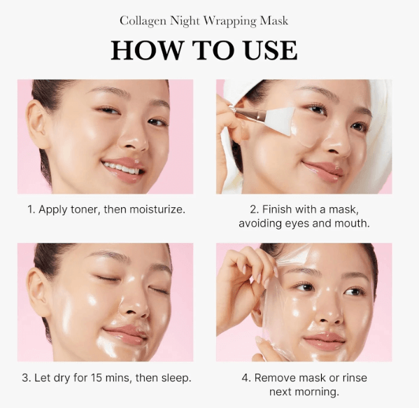Απλώστε τη μάσκα σε καθαρή επιδερμίδα και περιμένετε λίγη ώρα ώστε να δημιουργηθεί ένα λεπτό φίλμ κολλαγόνου. Κατά τη διάρκεια του ύπνου [8 ώρες] η μάσκα της Medicube προσφέρει τριπλή φροντίδα, εξασφαλίζοντας ελαστικότητα, ενυδάτωση και λάμψη. Σε αντίθεση με άλλες μάσκες απολέπισης, αφαιρείται εύκολα με μια κίνηση, αφήνοντας το δέρμα αναζωογονημένο και λαμπερό. Η μάσκα νυχτός Medicube Collagen Night Wrapping mask περιέχει ισχυρά συστατικά και προηγμένη τεχνολογία ώστε να παρέχει σφριγηλότητα, λάμψη και ενυδάτωση ακόμα και μετά την αφαίρεση του φίλμ. Επιπλέον περιέχει Ceramide NP για την ενίσχυση του δερματικού φραγμού και την ενυδάτωση, εκχύλισμα κολλαγόνου το οποίο χρησιμοποιείται για την ελαστικότητα και τη νεανική επιδερμίδα τέλος η αδενοσίνη χρησιμοποιείται για τη μείωση των λεπτών γραμμών μέσω της ανανέωσης του δέρματος.