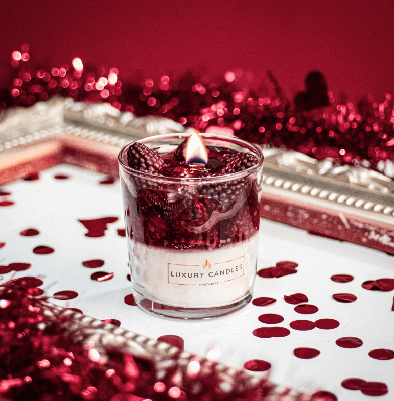 ➤ Σχεδιασμός: Το μισό δοχείο αποτελείται από κέρινα raspberries, τα οποία λιώνουν αρμονικά και εντάσσονται στο κάτω μέρος του κεριού, δημιουργώντας μία αρωματική και χρωματική εμπειρία.