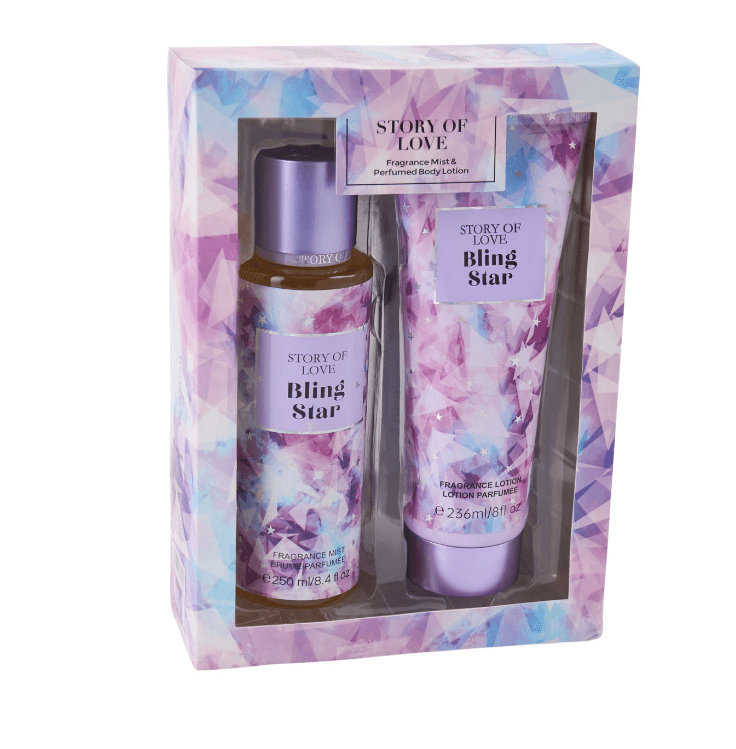 Απολαύστε το πολυτελές άρωμα “Bling Star” με μεθυστικές νότες γλυκιάς βανίλιας και πούδρας σε αυτό το όμορφα συσκευασμένο σετ, ιδανικό για να προσθέσετε μια πινελιά ρομαντισμού και κομψότητας στην καθημερινή σας ρουτίνα.